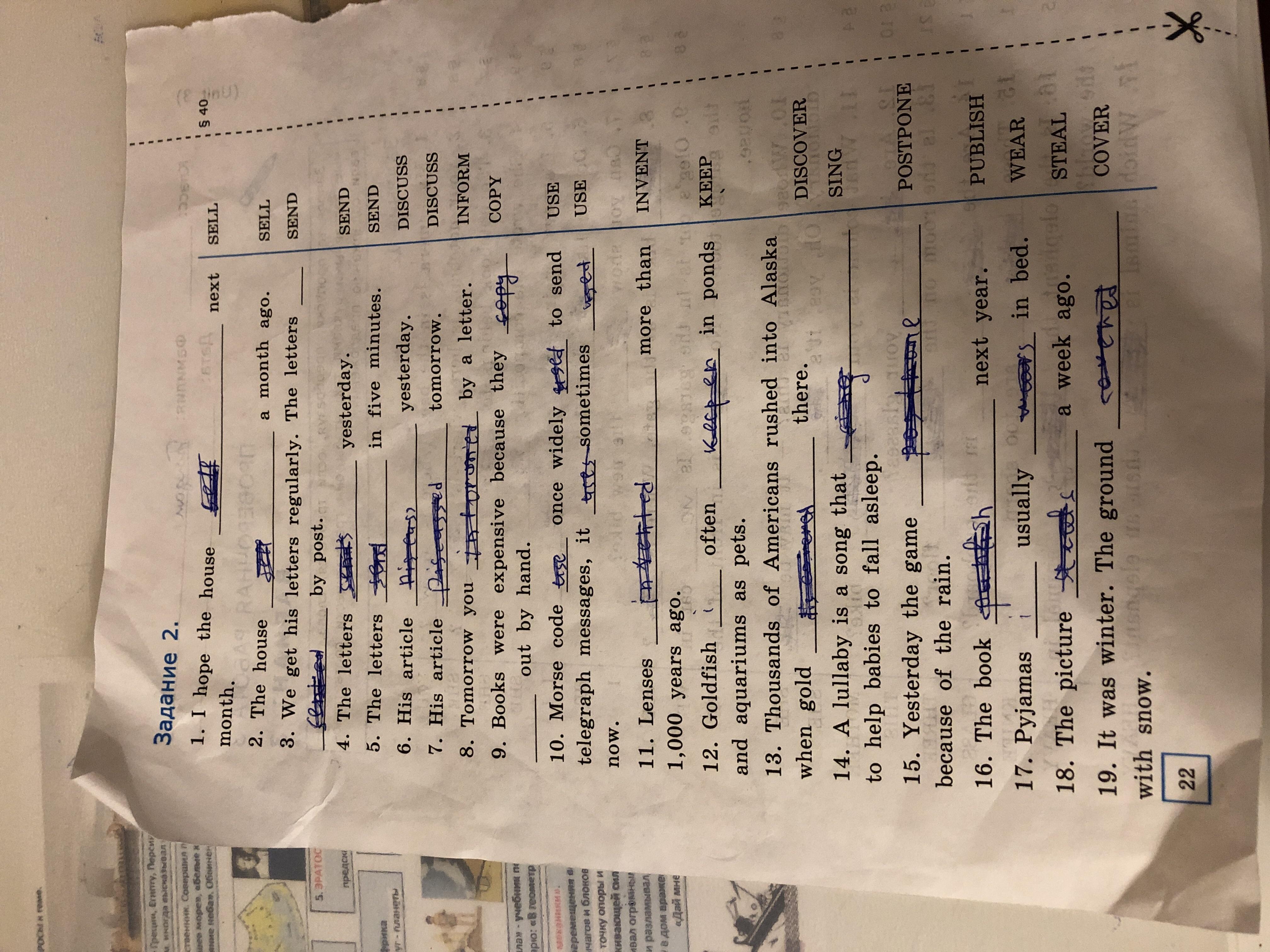 5. Will be sent. 6. Was discussed. 7.will be discussed. 8. Will be informed. 9. Were copied. 10. Was used, is used. 11. Were invented. 12. Is kept. 13.was discovered. 14.is sung. 15.was posponed. 16.will be published. 17. Are worn. 18. Was stolen. 19.was covered.