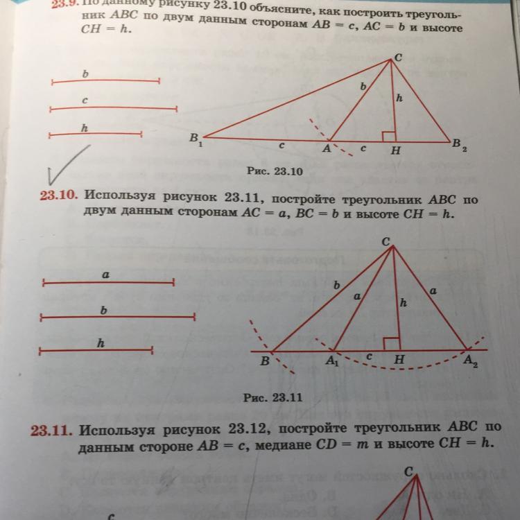 Используя рисунок 23.11, постройте треугольник АВС по двум данным сторонам АС = а, ВС = b и высоте СН = h.