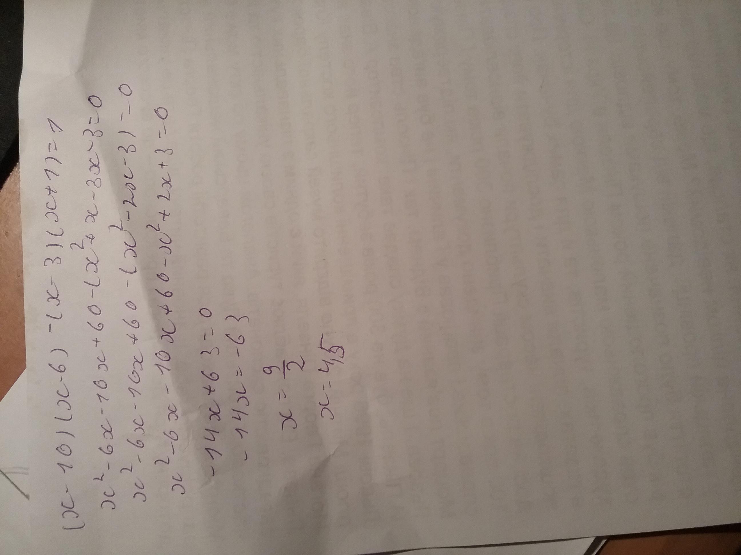 x2 - 6x - 10x +60 - x2 - x + 3x + 3 = 1