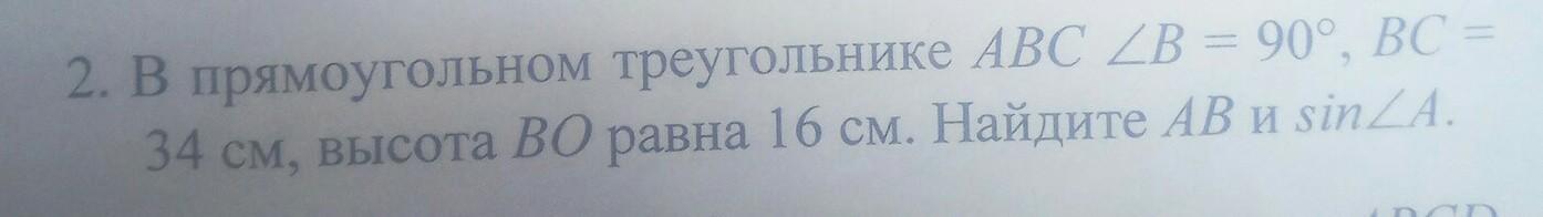 В прямоугольном треугольнике АВС угол В=90°, ВС=34см, высота ВО равна 16 см. Найдите АВ и sin угла А.