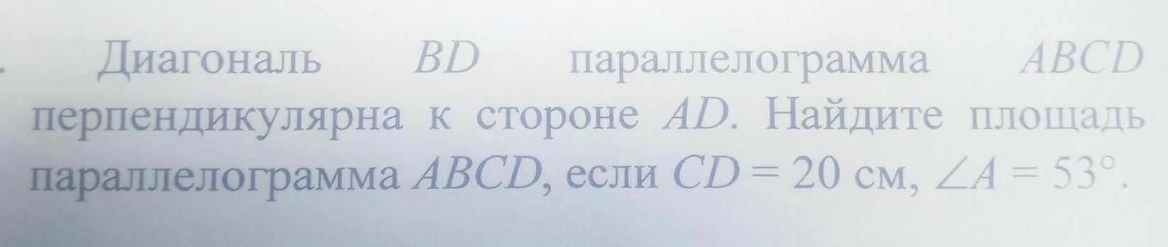 Диагональ BD параллелограмма ABCD перпендикклярна к стороге АD. Найдите площадь параллелограмма ABCD, если CD=20 см, угол А =53°.