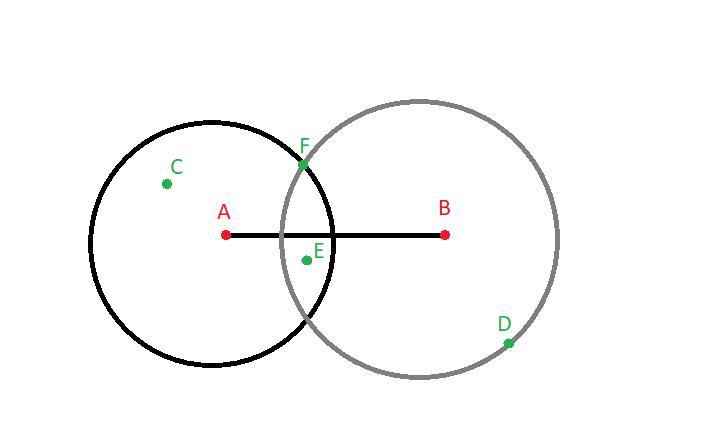 начертите отрезок AB и окружности с центрами в точках A и B так,чтобы они пересекались.Отметь точку,пренадлежащую