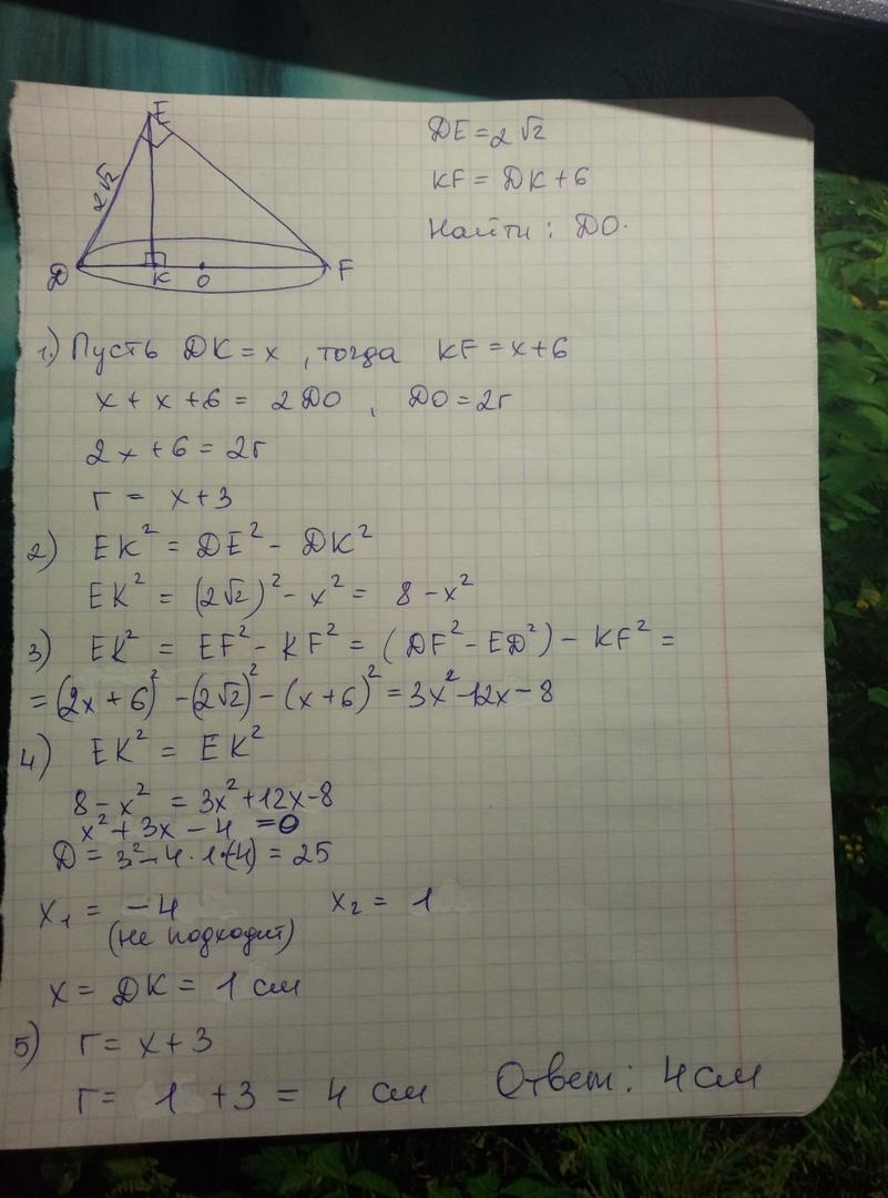 DE = 2 корень из 2 см. Найдите радиус окружности, если отрезок KF на 6 см