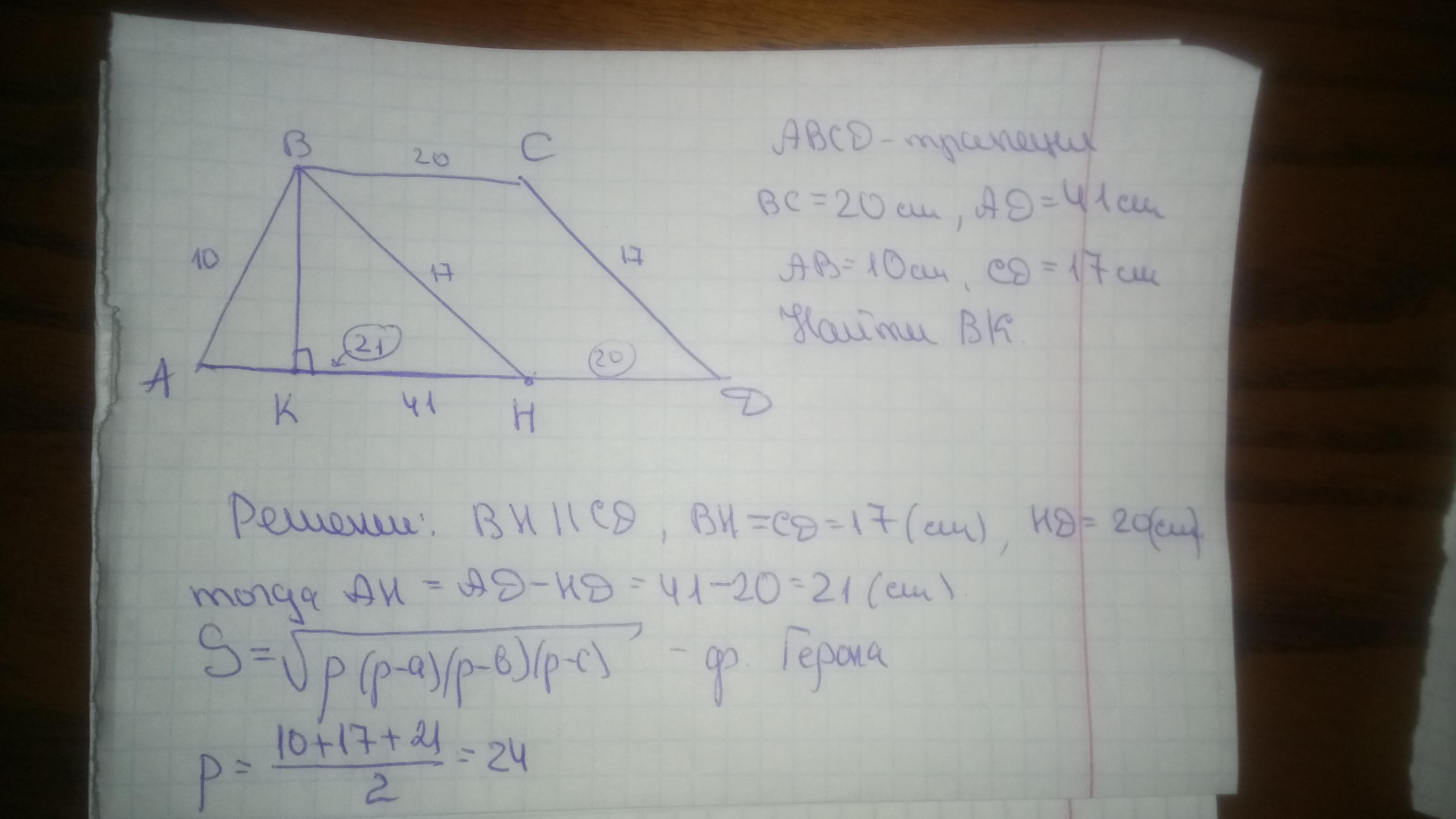 СРОЧНОО!1!!основания трапеции = 20 см и 41 см, а боковые стороны 10 см и 17 см. Найдите высоту трапеции