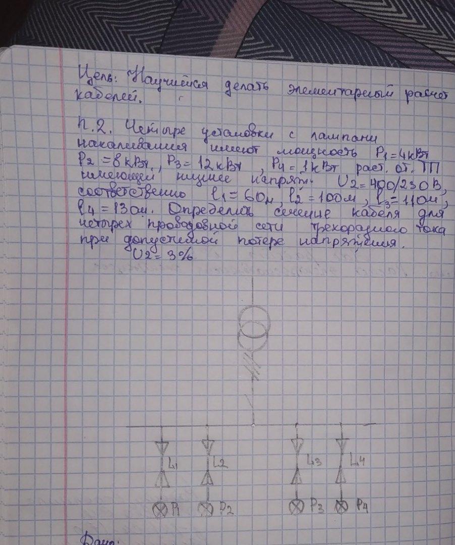 Срочнооооооо пожалуйста .Четыре установки с лампами накаливания имеют мощности P-1=4 кВт, P-2=8 кВт, P-3=12 кВт, P-4=1 кВт, расстояния от трансформаторной подстанции, имеющей низшее напряжение U=400⁄230 В, соответственно l_1=60 м, l_2=100 м, l_3=110 м, l_4=130 м. Определить сечение кабеля для четырехпроводной сети трехфазного тока при допустимой потере напряжения U_r=3%)