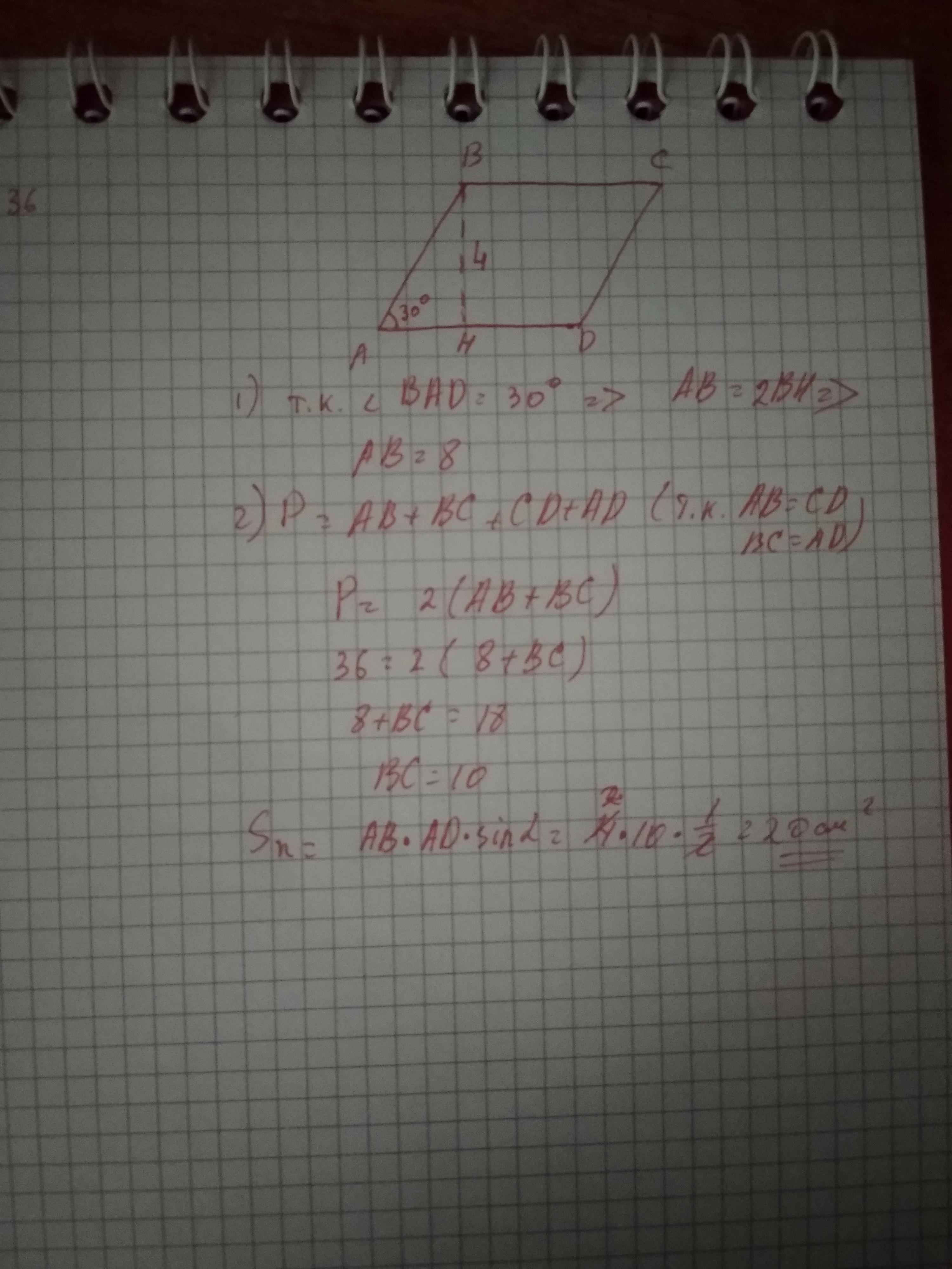 Периметр паралеллограмма равен 36 см найдите площадь паралеллограмма если его высота 4 см а один из углов 30 градусов