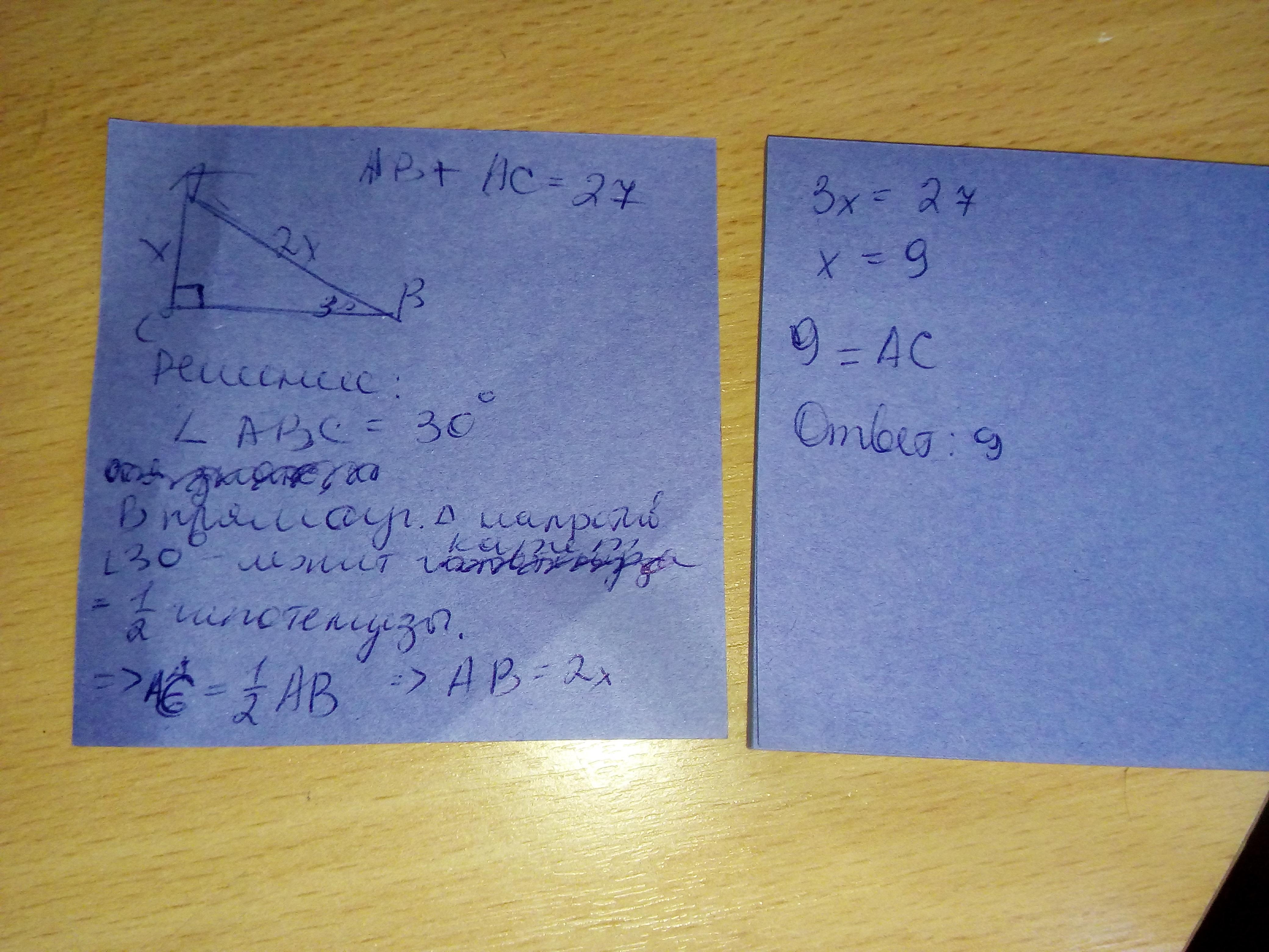 Один из углов прямоугольного треугольника равен 30 градусов, а сумма гипотенузы и меньшего катета равна 27 см. Найдите гипотенузу и меньший катет.
