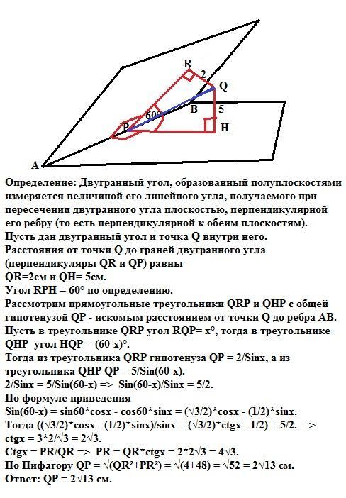 Расстояния от точки Q до граней двугранного угла (перпендикуляры QR и QP) равны QR=2см и QH= 5см.