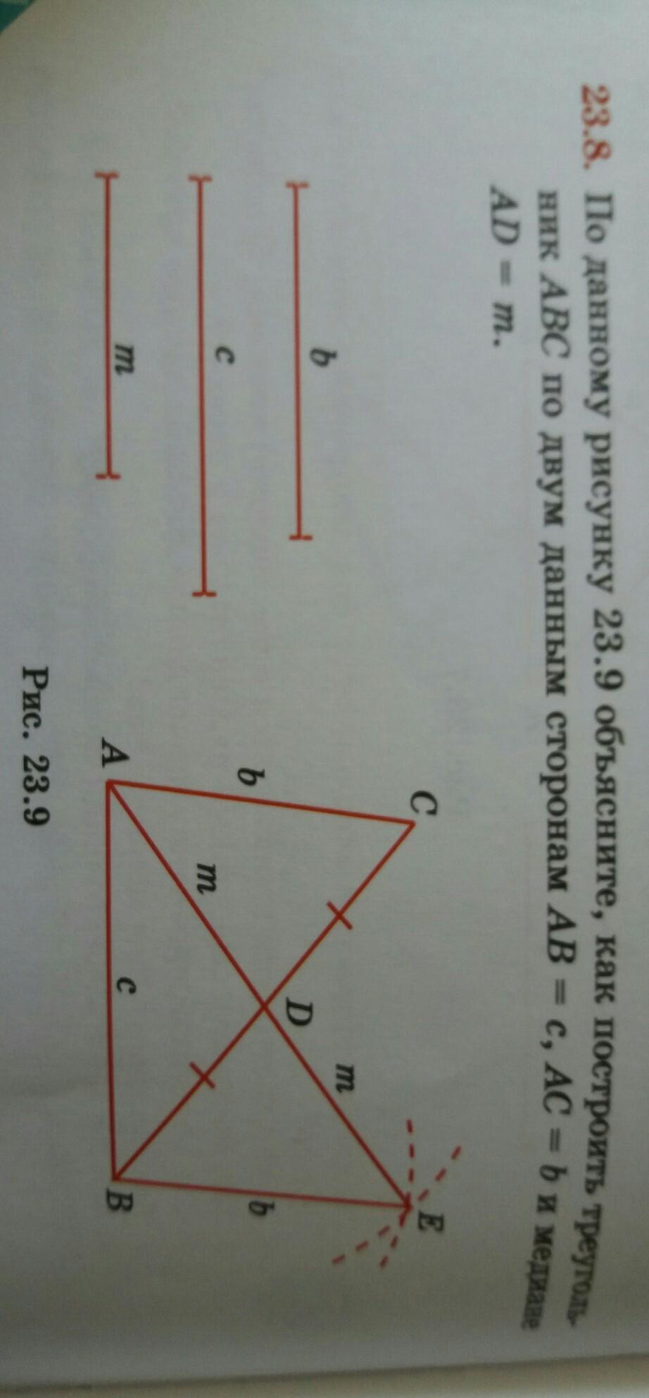 объясните как построить треугольник ABC по двум данным сторонам AB=c, AC=b и медиане AD=m.