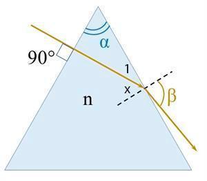 На поверхность правильной треугольной призмы падает луч света так, как изображено на рисунке. Рассчитай показатель преломления вещества, из которого изготовлена призма, если угол преломления луча при выходе из призмы β таков, что sinβ=0,87.