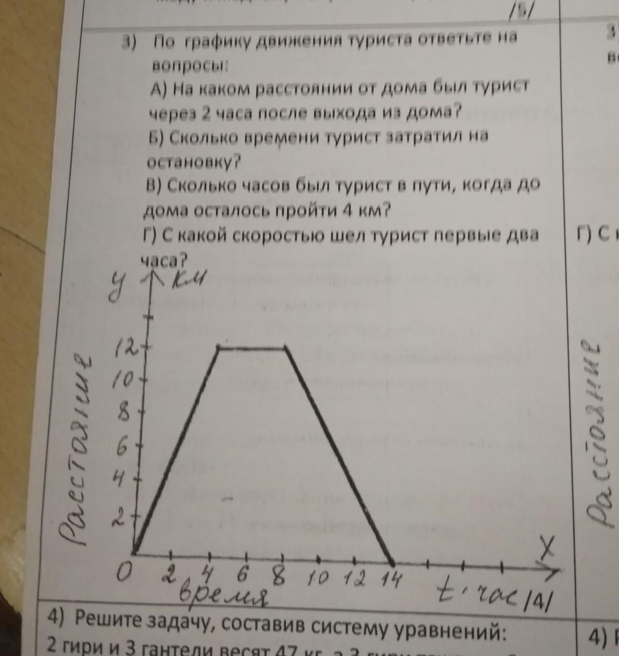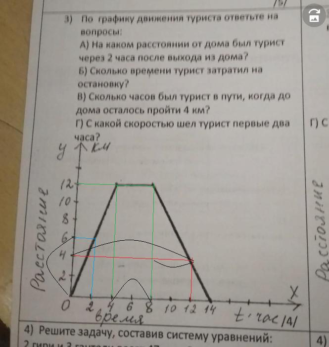 а) через 2 часа (перпендикуляр из точки 2 на оси времени х) турист был на расстоянии 6 км от дома (основание перпендикуляра к оси расстояний у)