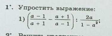 displaystylettbigg(frac{a-1}{a+1}-frac{a+1}{a-1} bigg):frac{2a}{1-a^2}=frac{(a-1)^2-(a+1)^2}{a^2-1}cdotfrac{1-a^2}{2a}=\\\= frac{a^2-2a+1-a^2-2a-1}{a^2-1}cdotfrac{-(a^2-1)}{2a}=frac{-4a}{1}cdotfrac{-1}{2a}=2