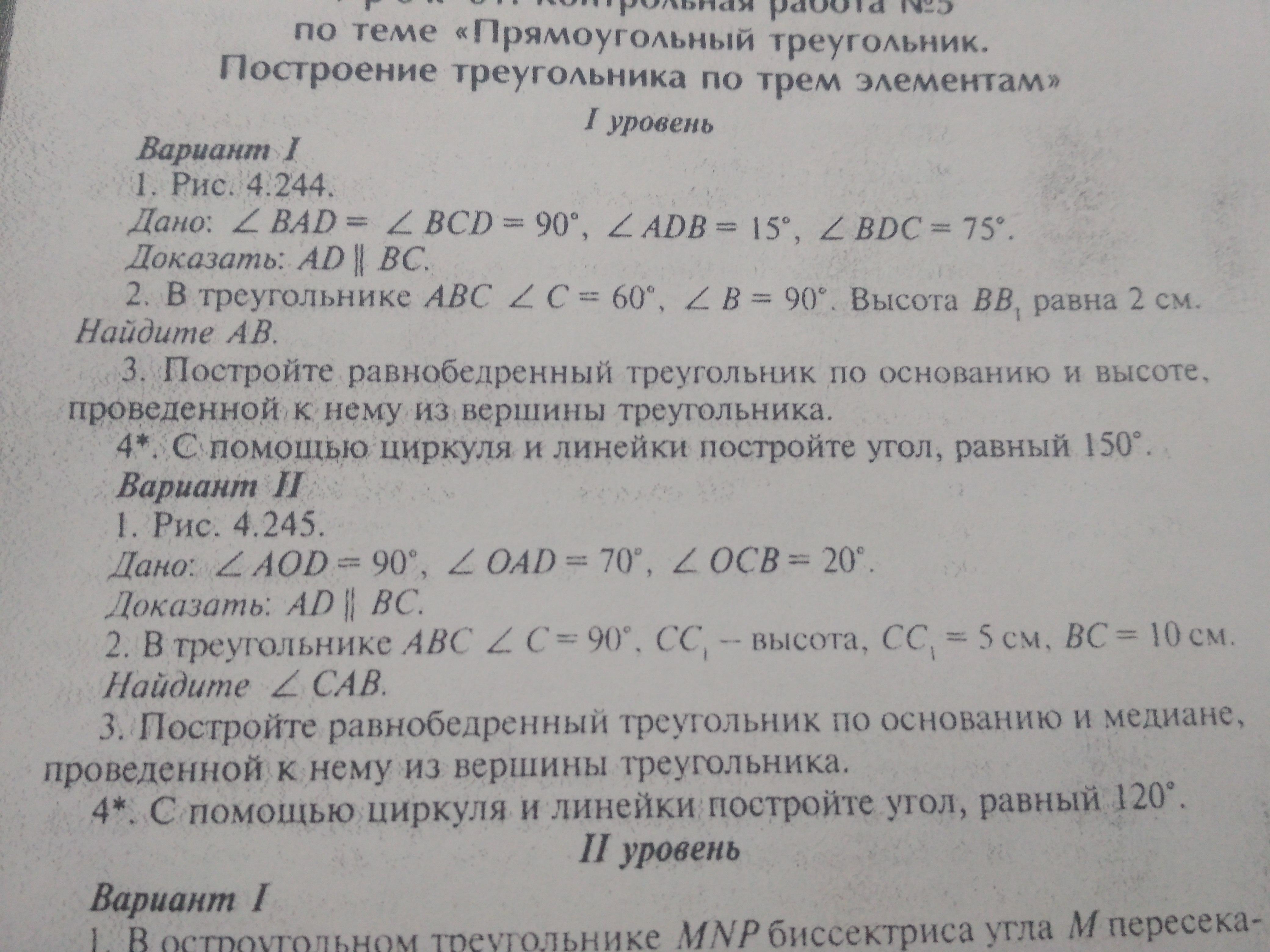 Геометрия. Контрольная работа номер 5 тема прямоугольный треугольник построения треугольник по трем элементам первый вариант не важен
