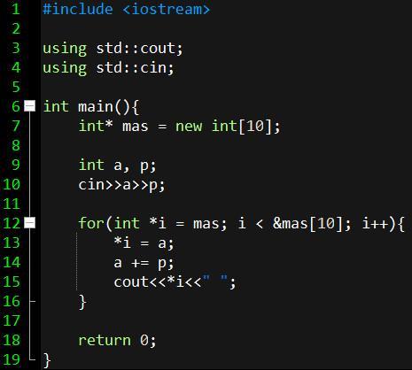 ПОМОГИТЕ, ПОЖАЛУЙСТА!!Дан массив из 10 элементов. Необходимо заполнить его первыми 10 членами арифметической прогрессии с заданными первым членом прогрессии a и её разностью p . Формат входных данных С клавиатуры вводятся целые числа a и p (−100≤a,p≤100 ). Формат выходных данных Требуется вывести содержимое массива после заполнения согласно условию задачи. Элементы должны разделяться пробелами. Примеры входные данные выходные данные 12 2 12 14 16 18 20 22 24 26 28 30. Помогите, пожалуйста на С++
