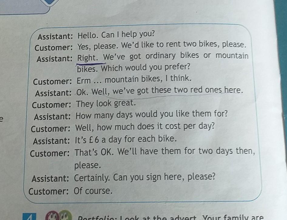 Ассистент: Привет. Я могу вам помочь? Клиент: Да, пожалуйста. Мы бы хотели взять напрокат два велосипеда, пожалуйста. Ассистент: Верно. У нас есть обычные велосипеды или горные велосипеды. Что бы вы предпочли? Заказчик: Хм .. горные велосипеды, я думаю. Ассистент: Хорошо. Ну, у нас есть эти два красных здесь. Заказчик: они отлично выглядят. Ассистент: Сколько дней вы хотели бы их? Заказчик: Ну, сколько это стоит в день? Помощник: это 6 фунтов в день за каждый велосипед. Клиент: все в порядке. У нас их будет два дня, пожалуйста. Ассистент: Конечно. Можете ли вы подписать здесь, пожалуйста? Заказчик: конечно. 3AKPbITb