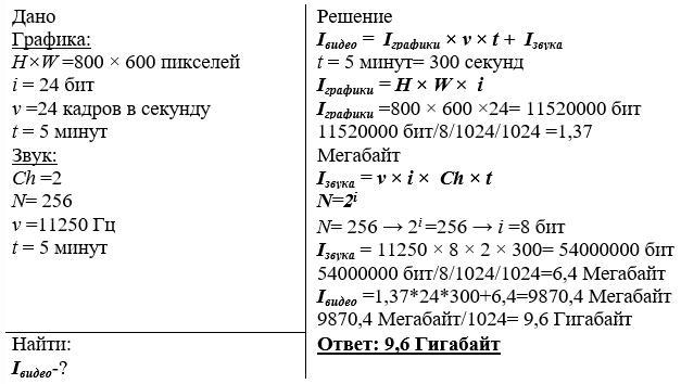 1. Какой объем будет иметь видео передаваемое с разрешением кадра 800 х 600 пикселей с 24 битовой глубиной цвета, скоростью воспроизведения 24 кадра в секунду и длительностью 5 минут. Известно, что стерео звук, наложенный на видео имеет 256 уровней громкости, частота дискретизации равна 11250 Гц.