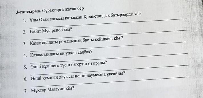 1. Мәншүк Мәметова,Әлия Молдағұлова,Бауыржан Момышулы,Қасым Қайсенов т.б
