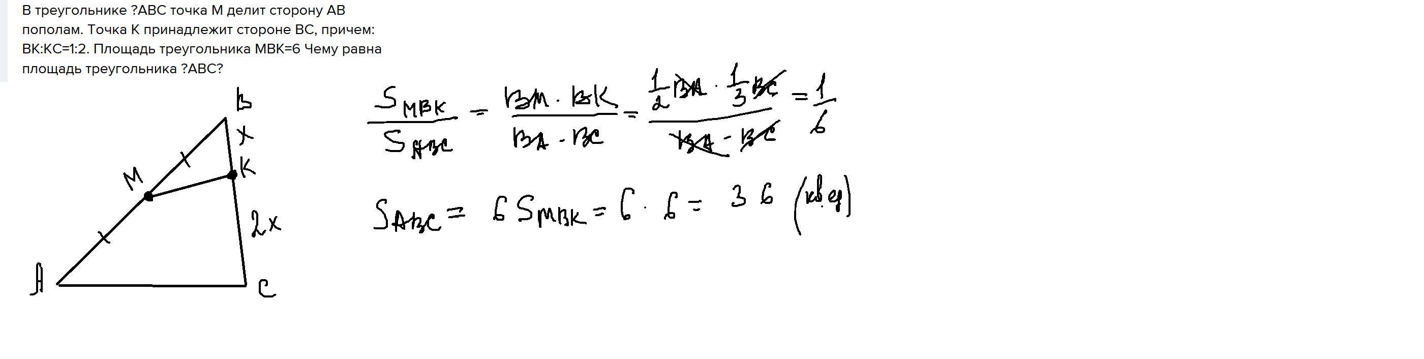 В треугольнике ?ABC точка M делит сторону AB пополам. Точка K принадлежит стороне BC, причем: BK:KC=1:2. Площадь треугольника MBK=6 Чему равна площадь треугольника ?ABC?