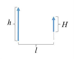 Предмет, высота которого h= 7 см, расположен на расстоянии l= 87 см от изображения, полученного в линзе (см. рис.). Высота изображения равна H= 5,6 см, определи вид линзы и расстояние от предмета до линзы.