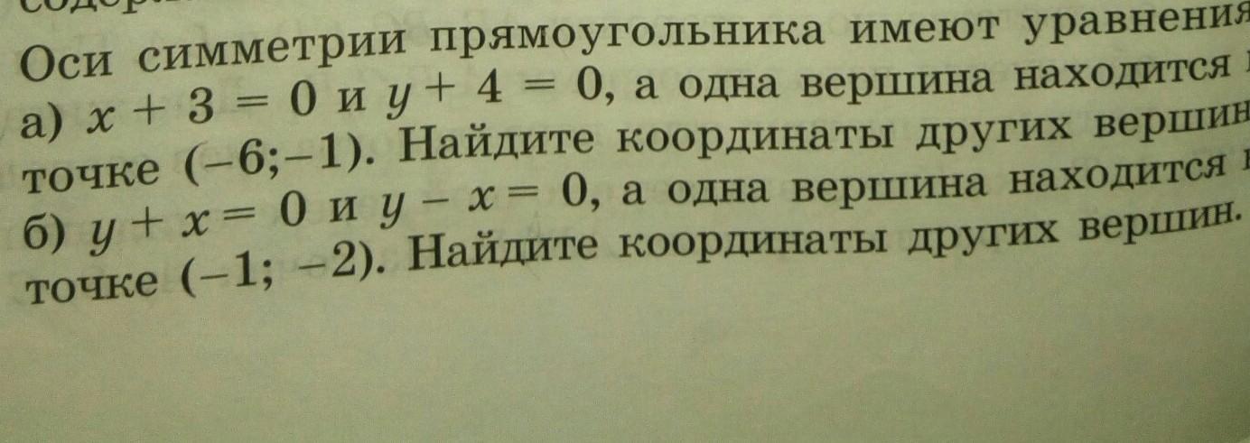 оси симметрии прямоугольника имеют уравнение у+х=0 и у-х=0 ,а одна вершина находится в точке(-1;2;) . Найти координаты других вершин