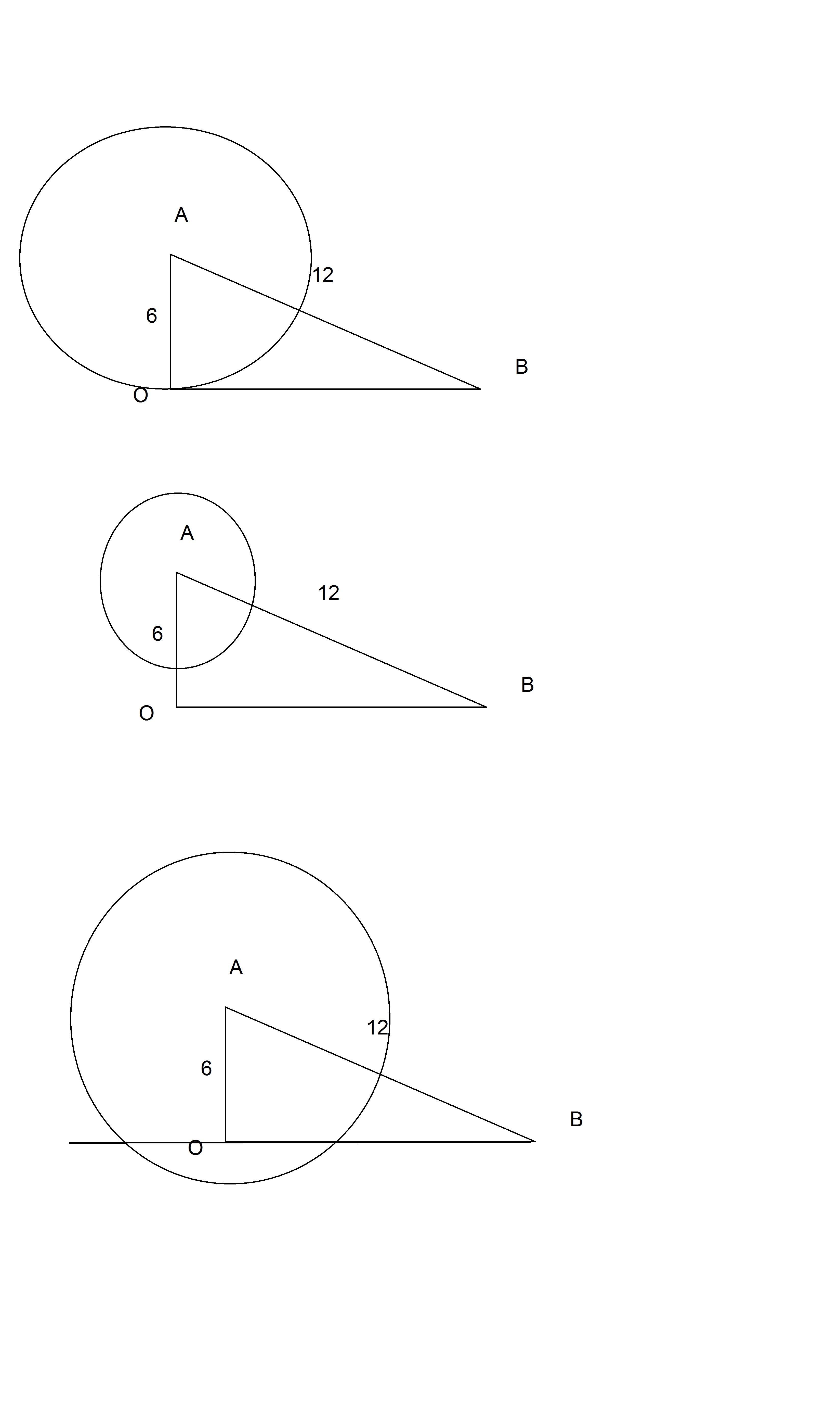 В прямоугольном треугольнике AOB (L0=90°)AB=12,LABO=30°.С центром в точке A проведена окружность.Каким должен быть её радиус,чтобы: