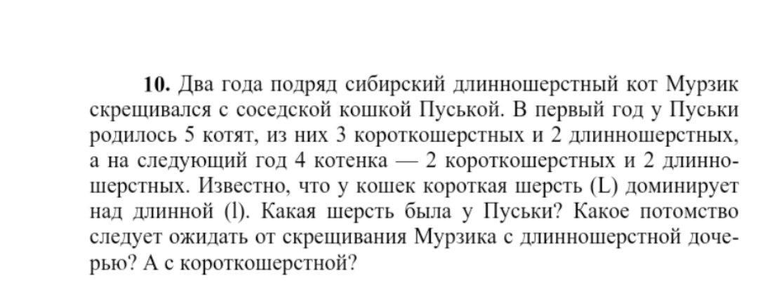 1. Кот Мурзик длинношерстный, значит его генотип по данному признаку ll.