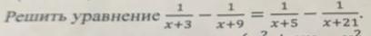 frac{1}{x+3}-frac{1}{x+9}=frac{1}{x+5}-frac{1}{x+21}\\frac{x+9-x-3}{(x+3)(x+9)}=frac{x+21-x-5}{(x+5)(x+21)}\\frac{6}{(x+3)(x+9)}=frac{16}{(x+5)(x+21)}\\xneq-3;xneq -9;xneq-5;xneq-21\\6(x+5)(x+21)=16(x+3)(x+9)\\3(x^{2}+21x+5x+105)=8(x^{2}+9x+3x+27)\\8x^{2}+96x+216-3x^{2}-78x-315=0\\5x^{2}+18x-99=0