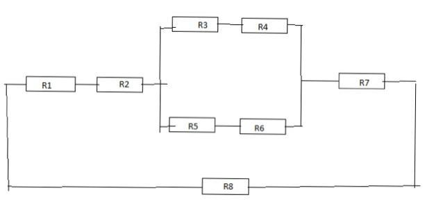 Найти силу тока цепи если напряжение всего участка цепи равно 120 В, а сопротивление R1= 2 Ом, R2= 3 Ом, R3=R4=5 Ом, R5=R6=2, R7=1 Ом, R8= 3 Ом.