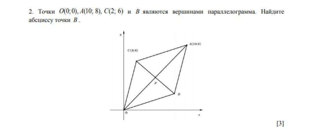 Точка O (0;0) A (10;8) C (2;6) и B является вершинами Парплелограмма. Найдите абцису точки B