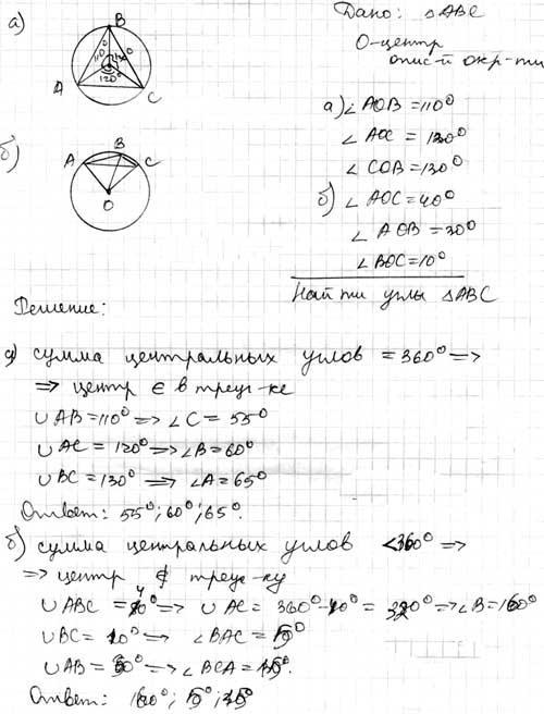 Найдите углы треугольника, две стороны которого видны из центра описанной окружности под углами 10 градусов и 40 градусов. Нарисуйте рисунок этого задания