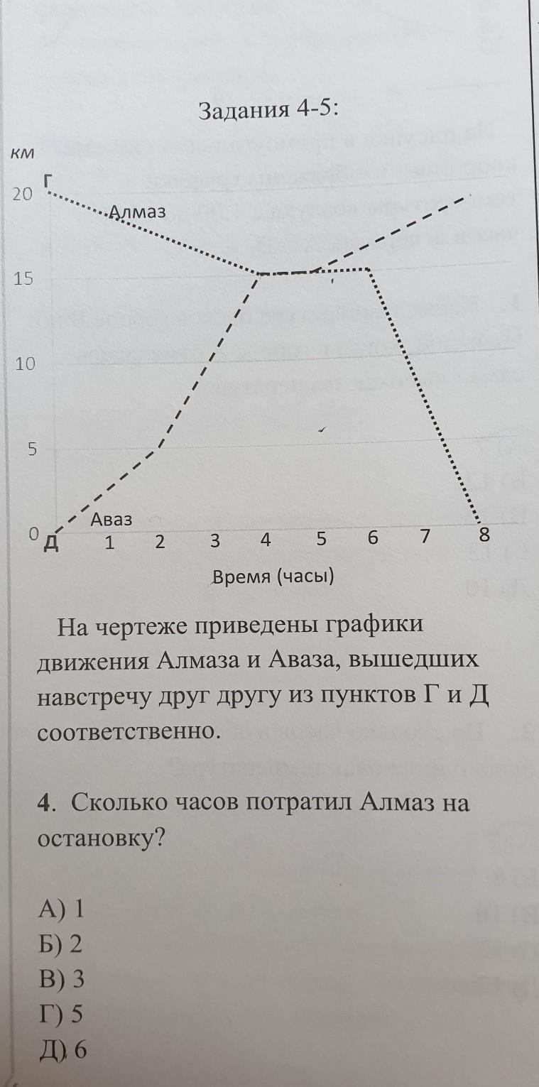 Горизонтальная линия идёт от отметки 4 часа до отметки 6 часов. Значит на остановку Алмаз потратил 6-4=2 часа.