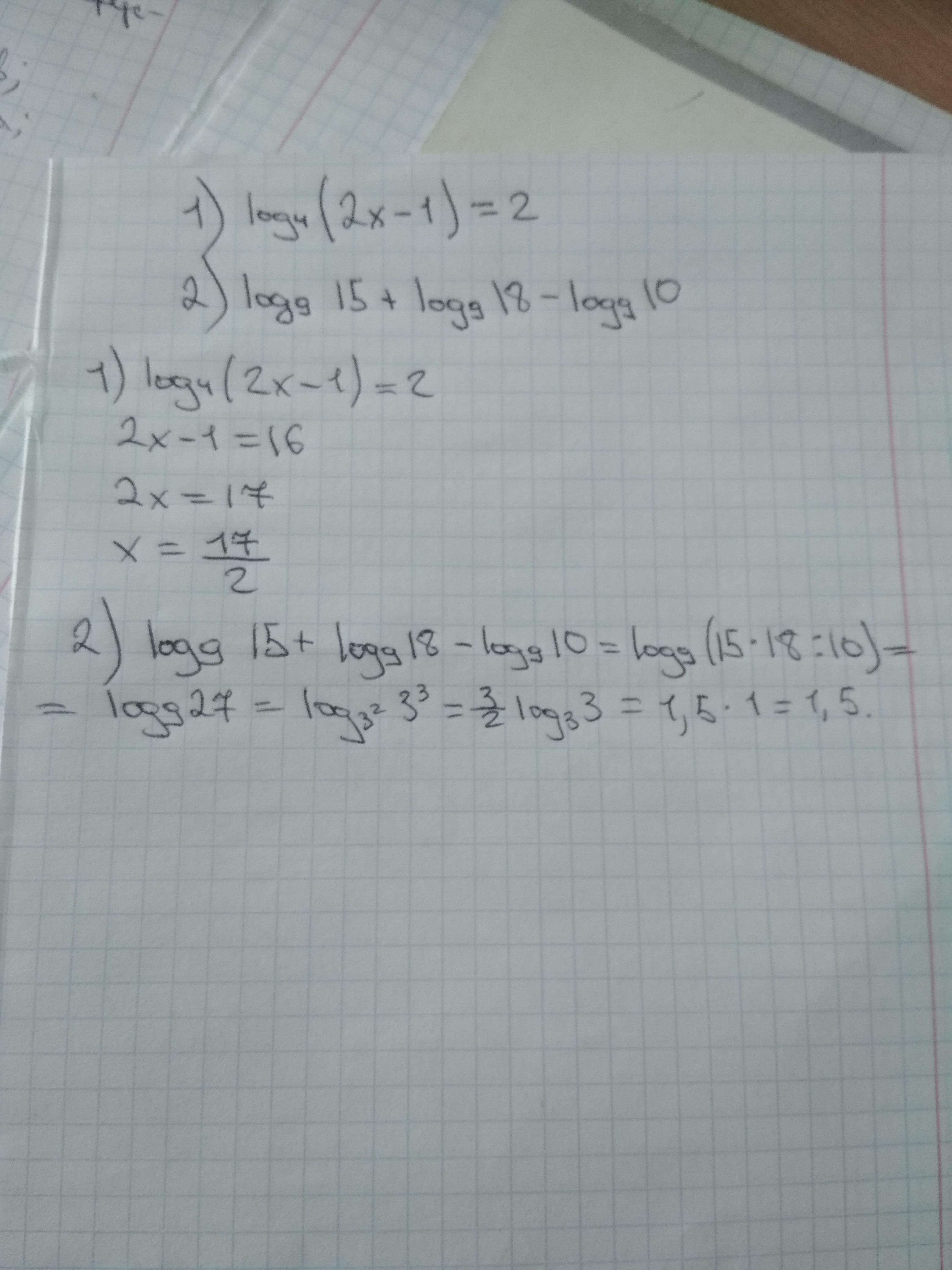 2) по свойству логорифмов , если основания у них одинаковые тогда при сложении логорифмов ты перемножаешь их числа,а если стоит минус то делишь числа логорифмов , затем 9 и 27 возводишь в степени(9=3^2;27=3^3) 2 переходит как 1/2 в начало логорифма а 3ка как числитель этой дроби , логорифмов с одинаковым основанием и числом равен еденице