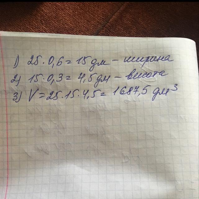 Довжина прямокутного паралелепіпеда 25 дм ширина становить 60% довжини а висота 30% ширини . Знайди обєм.