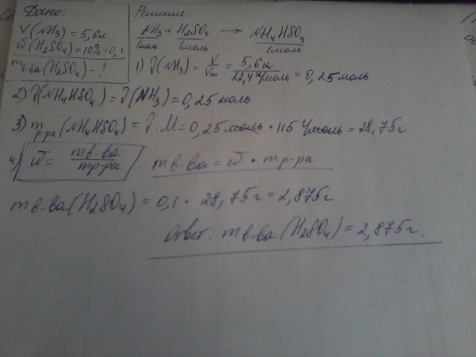 после испускания 5,6 л аммиака через раствор серной кислоты с массовой долей 10 процентов получили раствор срденей соли. определите массу исходного раствора серной кислоты