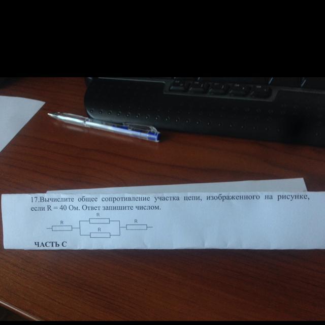 Rобщ = R + R + (R×R)/(R+R) = 40 Ом + 40 Ом + (40 Ом × 40 Ом)/(40 Ом + 40 Ом) = 100 Ом.