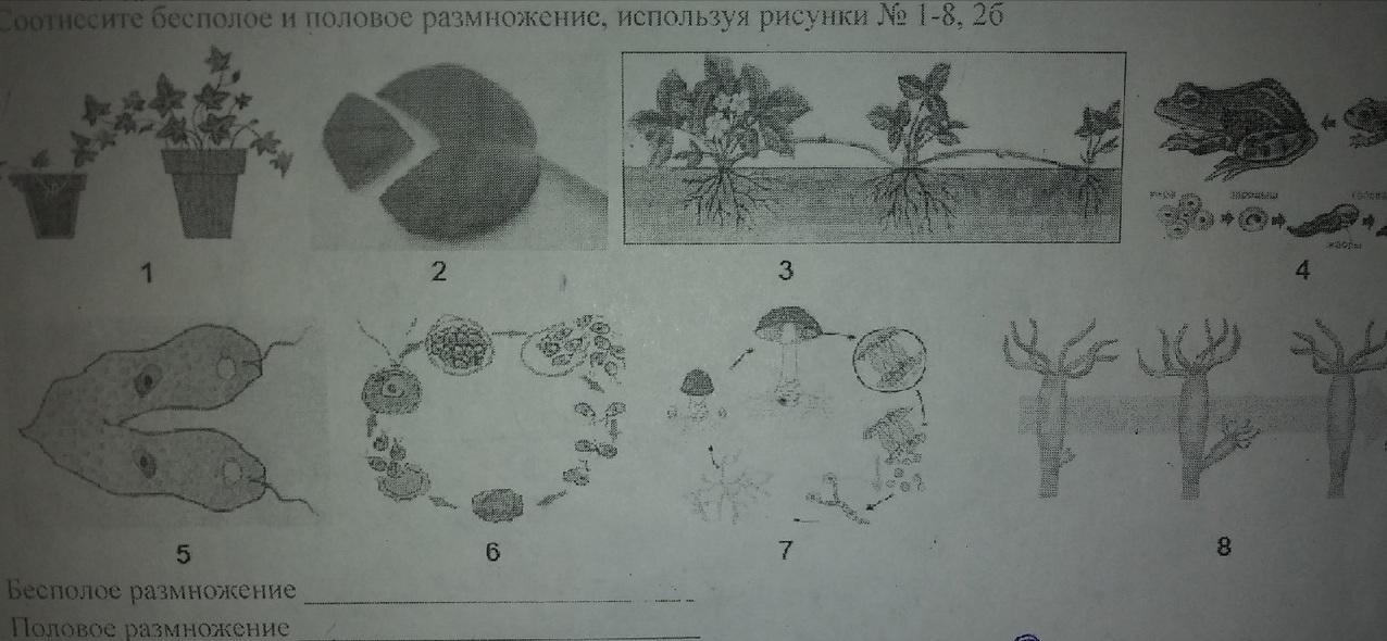 Соотнесите бесполое и половое размножение, используя рисунки 1-8