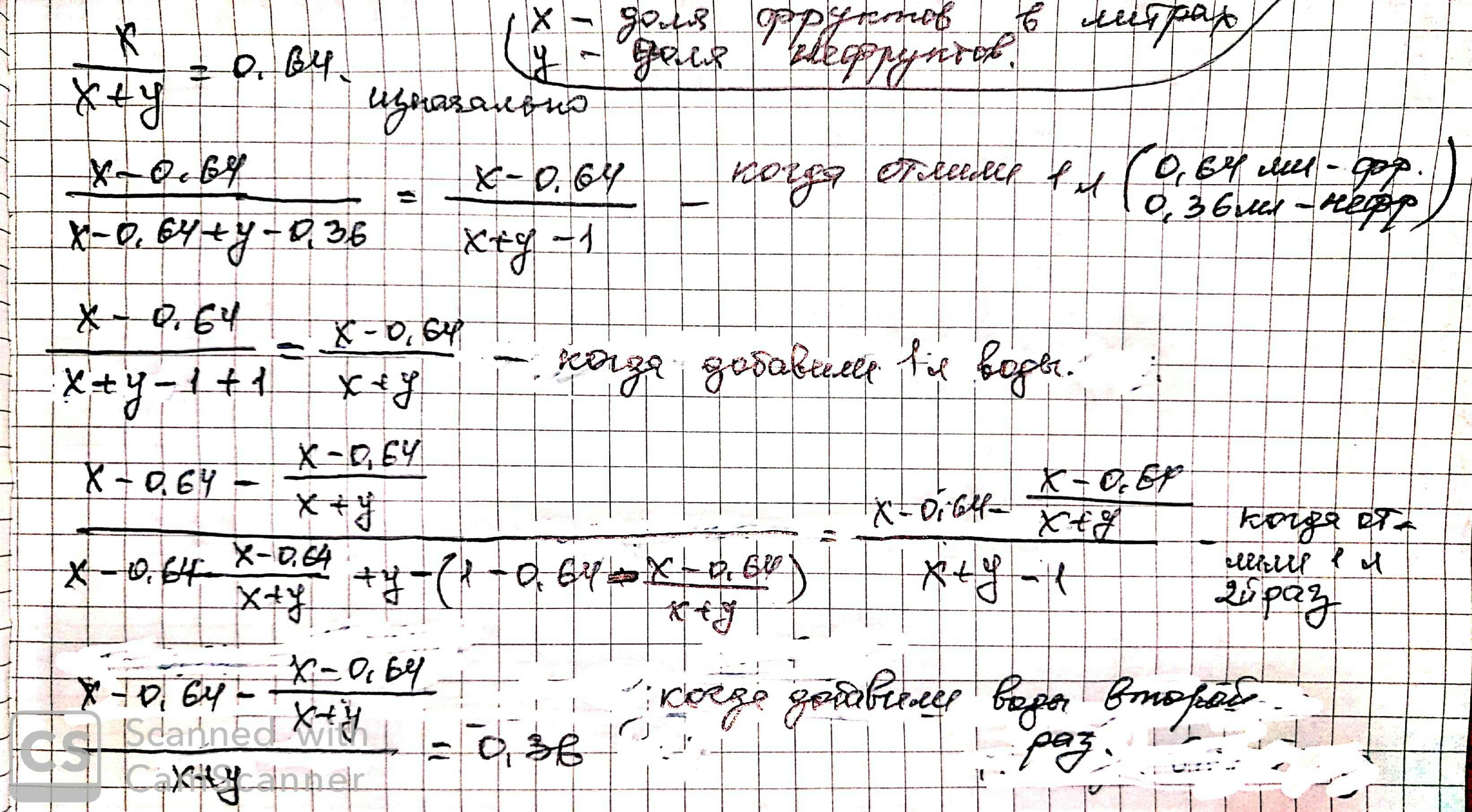 Представим что мы уже отлили 2л из пакета. Тогда х - это фруктовая часть в литрах, а вода - у. Получаем: