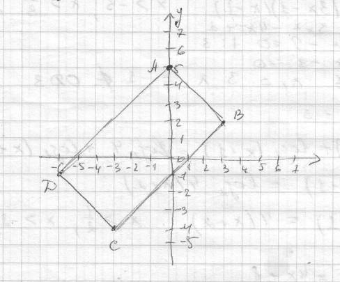 3)постройте в координатной плоскости прямоугольник с вершинами в точках A(0;5),B(3;2),C (-3;-4),D (-6;-1).Выполняйте необходимые измерения.Найдите периметр и площадь.
