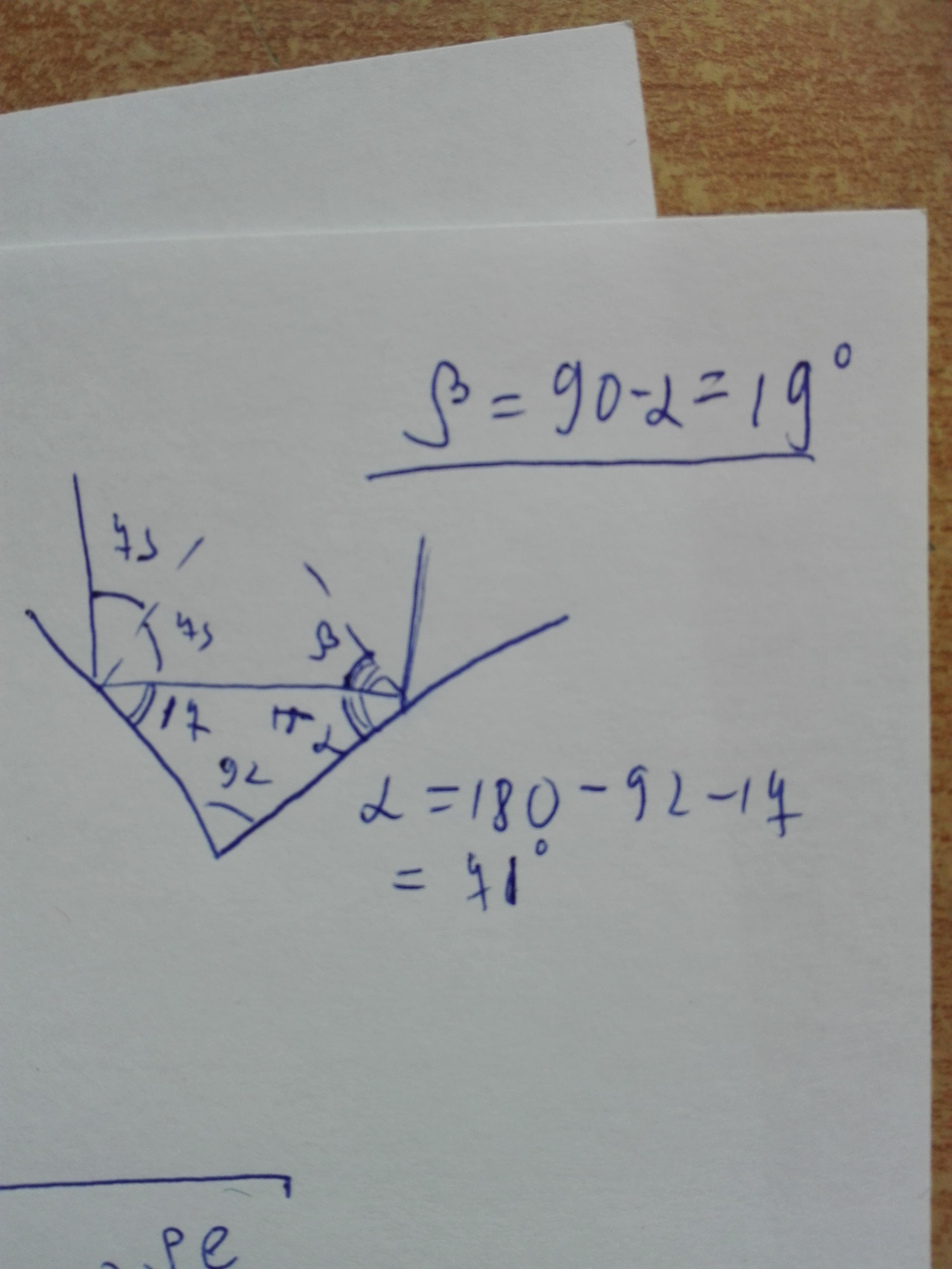 Два зеркала расположены под углом ϕ = 92°. Найди, чему равен угол отражения от второго зеркала, если угол падения на первое α = 73°?