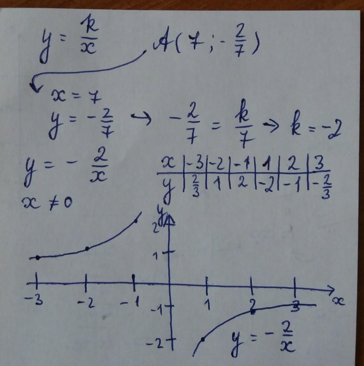 Найдите k при котором график функции y=k/x проходит через точку А(7;-2/7) постройте график данной функции .