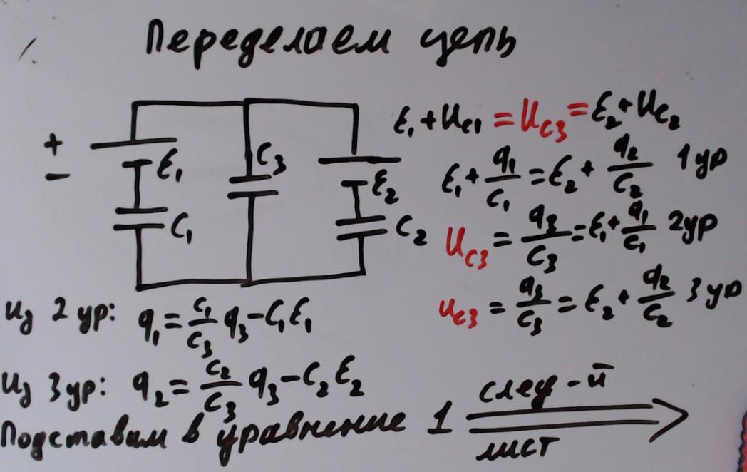 Определите заряды конденсаторов q1 ,q2, q3 в цепи , параметры которой указаны на рисунке.