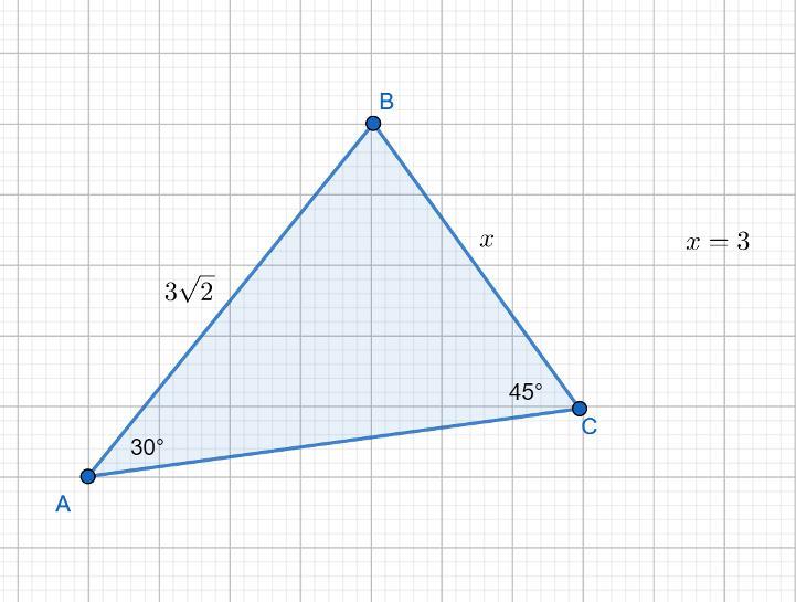 x = sin30° * 3√2 / sin45° = (1/2) * (3√2) / (√2/2) = (1* 3√2 * 2) / (2 *√2) = 3.