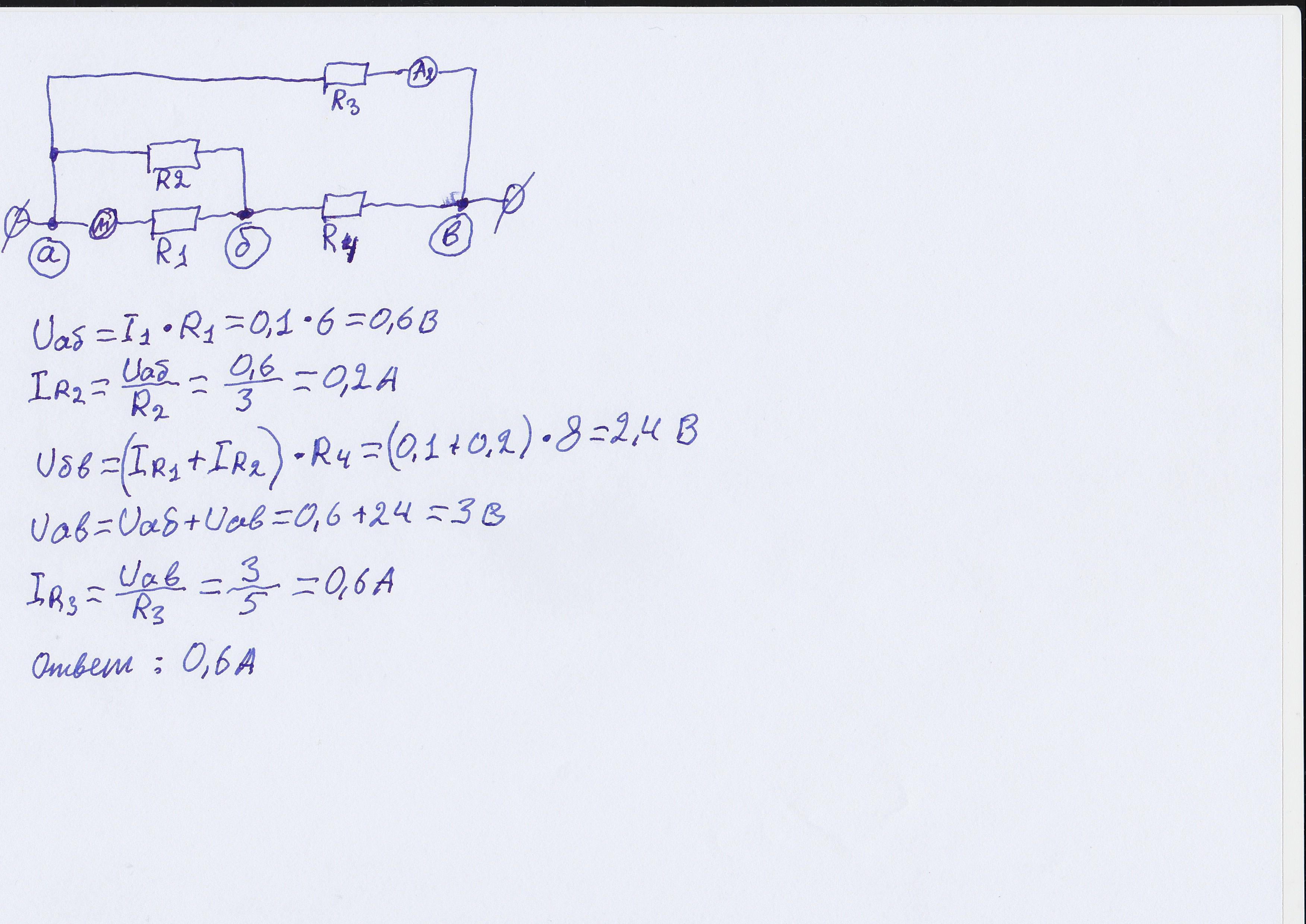 I1(амперметра)=I2+I23=0,1А+0,5 = 0,6 А