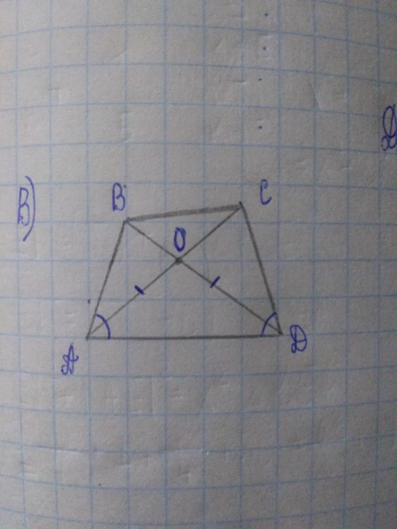 Так как АО = ОД, то треугольник АОД - равнобедренный, значит, угол ОАД = углу ОДА. Так как углы А и Д равны, то ∠ВАО = ∠А - ∠ОАД = ∠Д - ∠ОДА = ∠СДО. Углы ВОА и СОД - вертикальные, значит, равны. Значит треугольники АВО и СОД равны по стороне и двум прилежащим к ней углам. Значит, АВ = СД