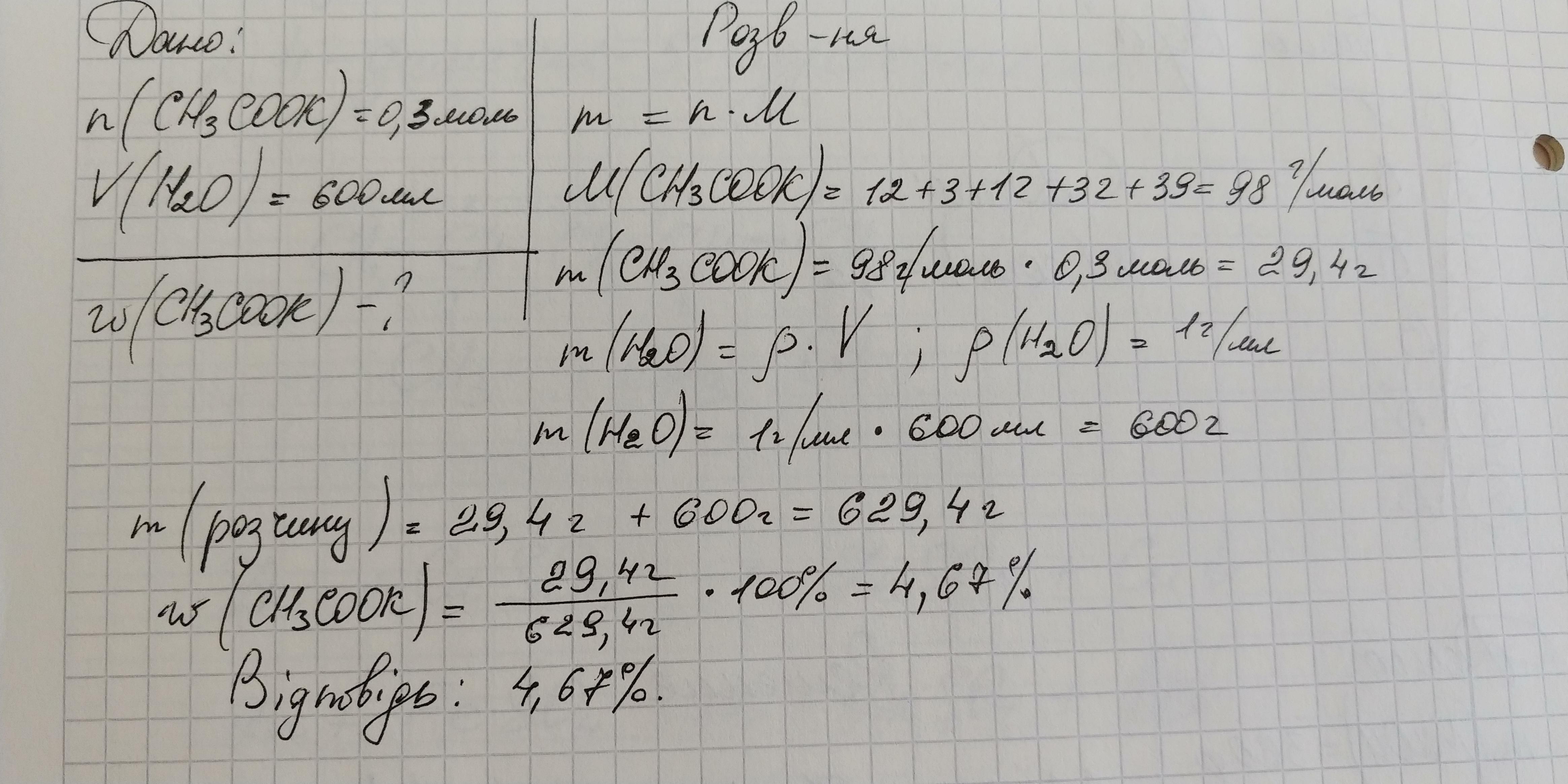 Калій ацетат кількість якого становлять 0,3 моль, розчинили у 600 мл води. Обчислити масову частку солі (%) в одержаному розчині