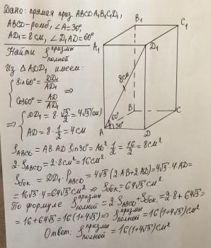 Основанием прямой призмы является ромб с острым углом 30°.диагональ боковой грани 8 см и образует с плоскостью основания угол 60° найдите площадь полной поверхности призмы