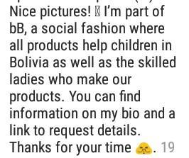 Хорошие картинки! Я являюсь частью bB, социальной моды, где все продукты помогают детям в Боливии, а также опытным женщинам, которые делают наши продукты. Вы можете найти информацию о моей биографии и ссылку на детали запроса. Спасибо за ваше время .19