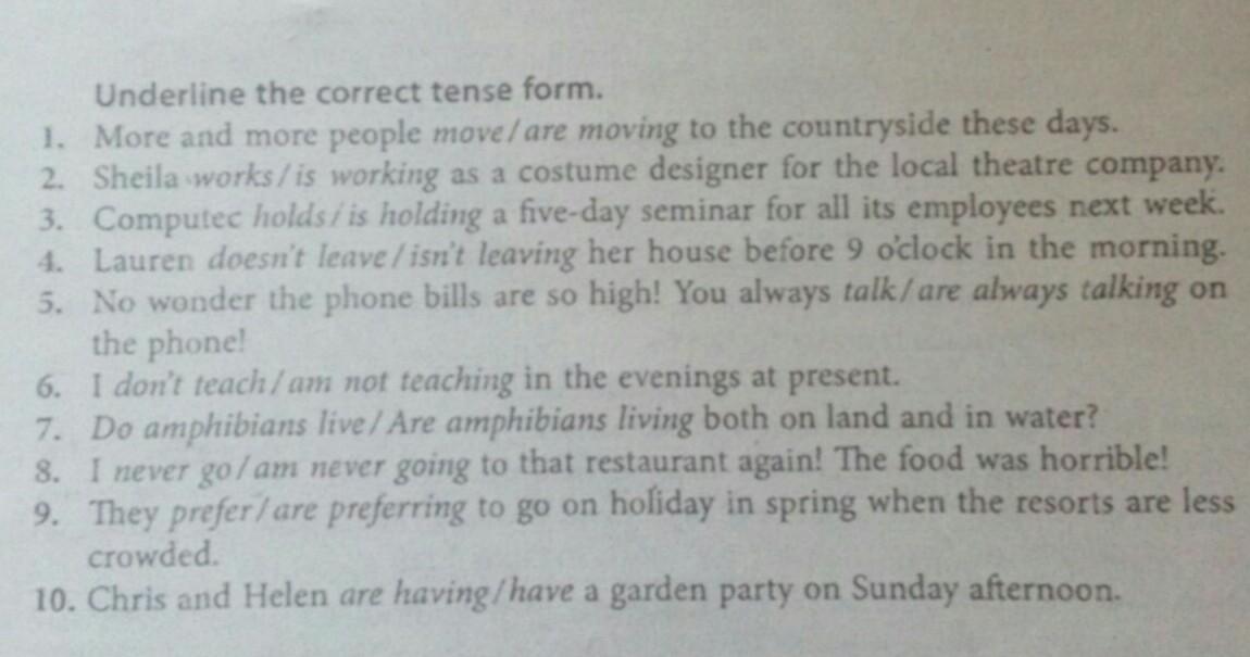 1.Move 2.Is working 3.holds 4.doesnt leave 5.always talk 6.am not teaching 7.Do amphibian live 8.never go 9.prefer 10.have