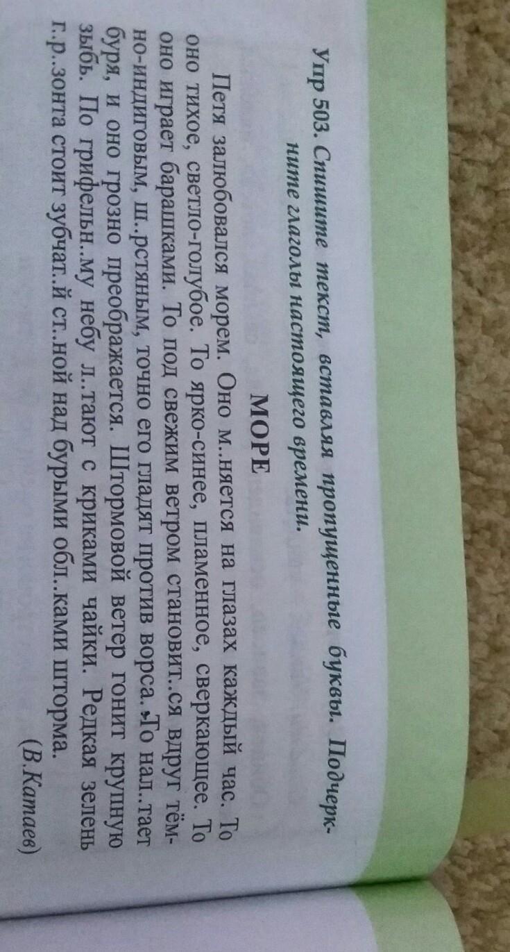Петя залюбовался морем. Оно меняется (гл. наст. вр.) на глазах каждый час. То оно тихое, светло-голубое. То ярко-синее, пламенное, сверкающее. То оно играет (гл. наст. вр.) барашками. То под свежим ветром становится (гл. наст. вр.) вдруг темно-индиговым, шерстяным, точно его гладят (гл. наст. вр.) против ворса. То налетает(гл. наст. вр.) буря, и оно грозно преображается(гл. наст. вр.). Штормовой ветер гонит (гл. наст. вр.) крупную зыбь. По грифельному небу летают (гл. наст. вр.) с криками чайки. Редкая зелень горизонта стоит (гл. наст. вр.) зубчатой стеной над бурыми облаками шторма.