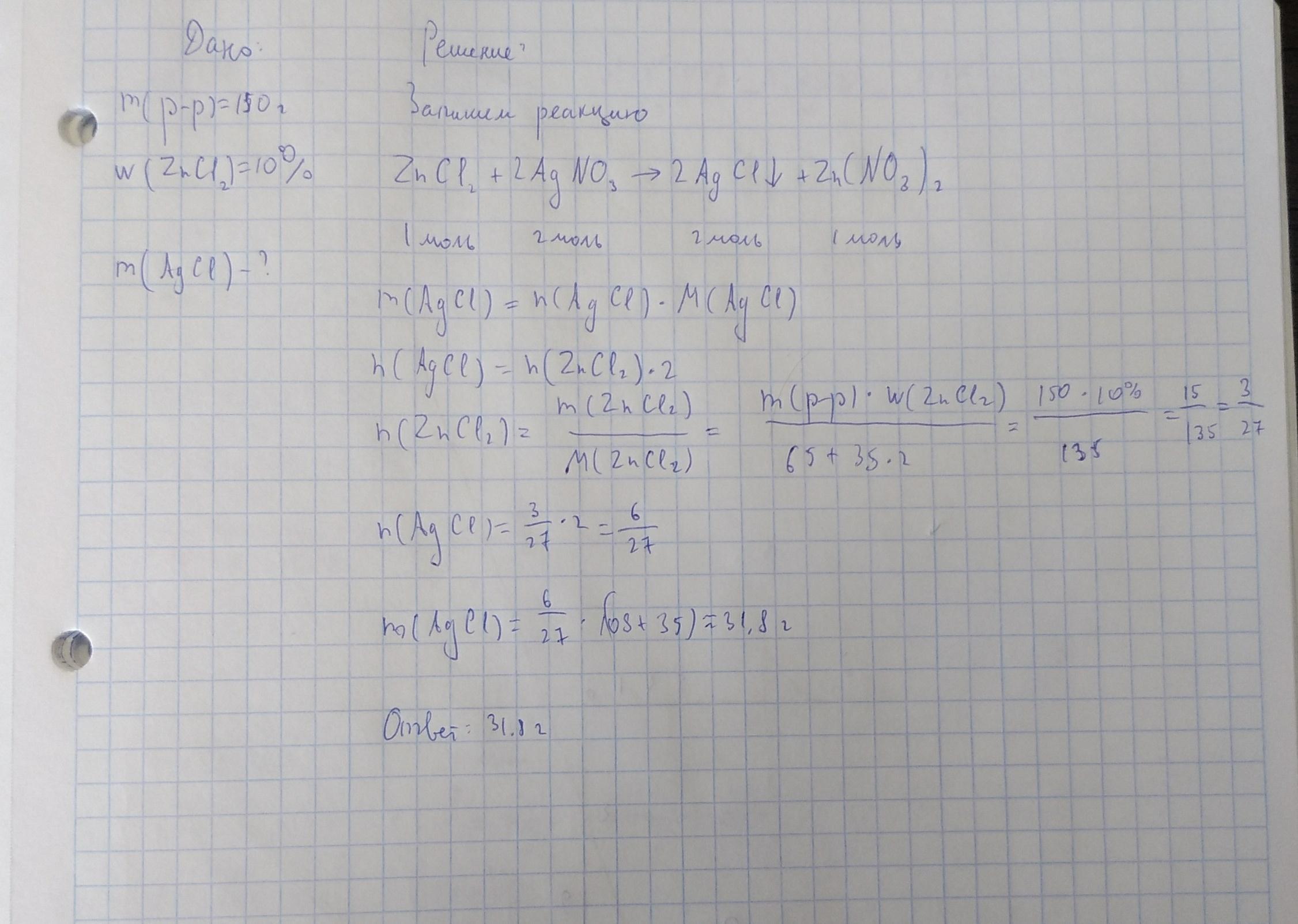 ХИМИЯ 8 КЛАСС!ЗАДАЧА ПОМОГИТЕ!Рассчитайте массу осадка,который образуется при взаимодействии растворов нитрата серебра и хлорида цинка,если масса раствора хлорида цинка 150 г,а массовая доля хлорида цинка в нем составляет 10%.ЖЕЛАТЕЛЬНО С ДАНО